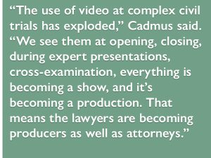 “The use of video at complex civil trials has exploded,” Cadmus said. “We see them at opening, closing, during expert presentations, cross-examination, everything is becoming a show, and it’s becoming a production. That means the lawyers are becoming producers as well as attorneys.”