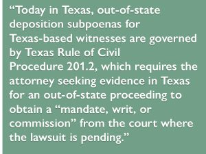 Today in Texas, out-of-state deposition subpoenas for Texas-based witnesses are governed by Texas Rule of Civil Procedure 201.2, which requires the attorney seeking evidence in Texas for an out-of-state proceeding to obtain a “mandate, writ, or commission” from the court where the lawsuit is pending. Only when presented with one of these documents will Texas courts compel the witness to appear and testify in a deposition seeking discovery in an out-of-state lawsuit. Because Texas is not a UIDDA jurisdiction, its attorneys cannot take advantage of the UIDDA process for interstate discovery in states where UIDDA has already been adopted.